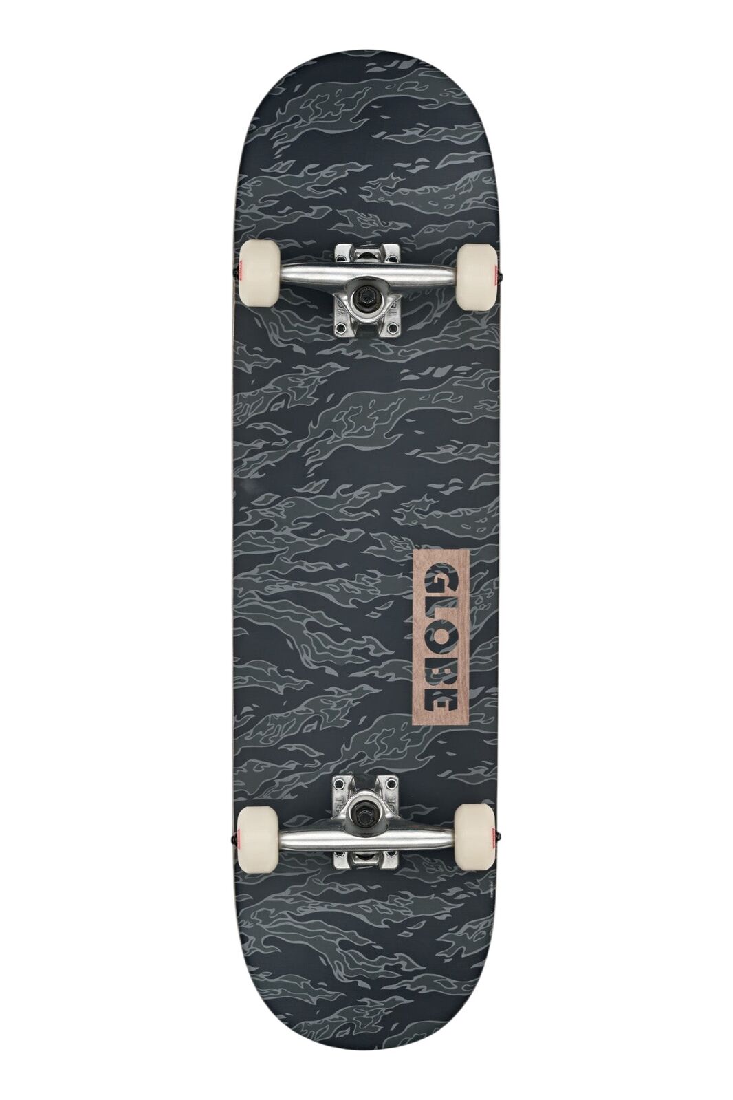 The "Goodstock - Black Camo" Resin-7 ply Hard Rock Maple deck is 8.5" wide x 32.2" length x 14.25" wheelbase with full concave and wood knock-out logo. It comes complete with 6.0" Tensor alloy trucks, 52mm 99a wheels, and Abec-7 bearings.