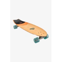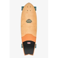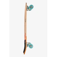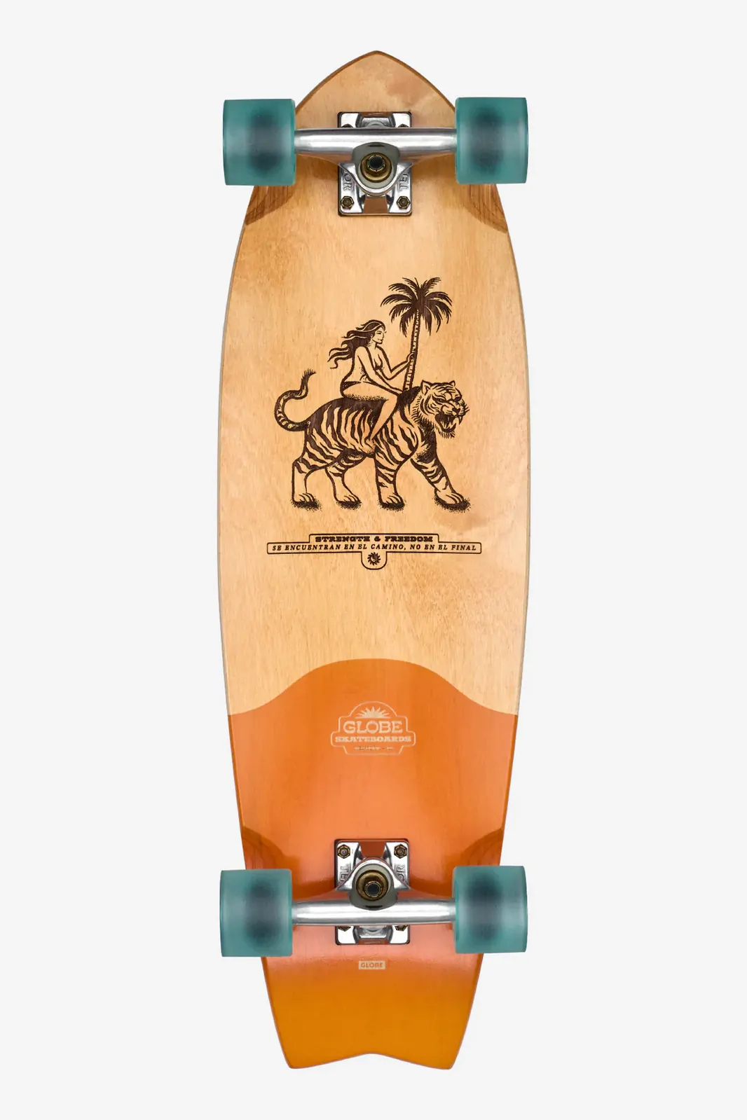 Sun City “La Tigra” is a short-length surf inspired swallow-tail cruiser in Resin-7 hard rock maple with paint dip and laser-etched art on the bottom. This board is 9.0” wide x 30” length x 18.5” wheelbase, and has a very mellow side-to-side concave with a kick tail. It comes with clear broadcast grip with algae-foam tailpad for barefoot riding, Tensor Alloy trucks, 62mm 83a clear colored urethane Conical Cruiser wheels, and Abec-7 bearings.