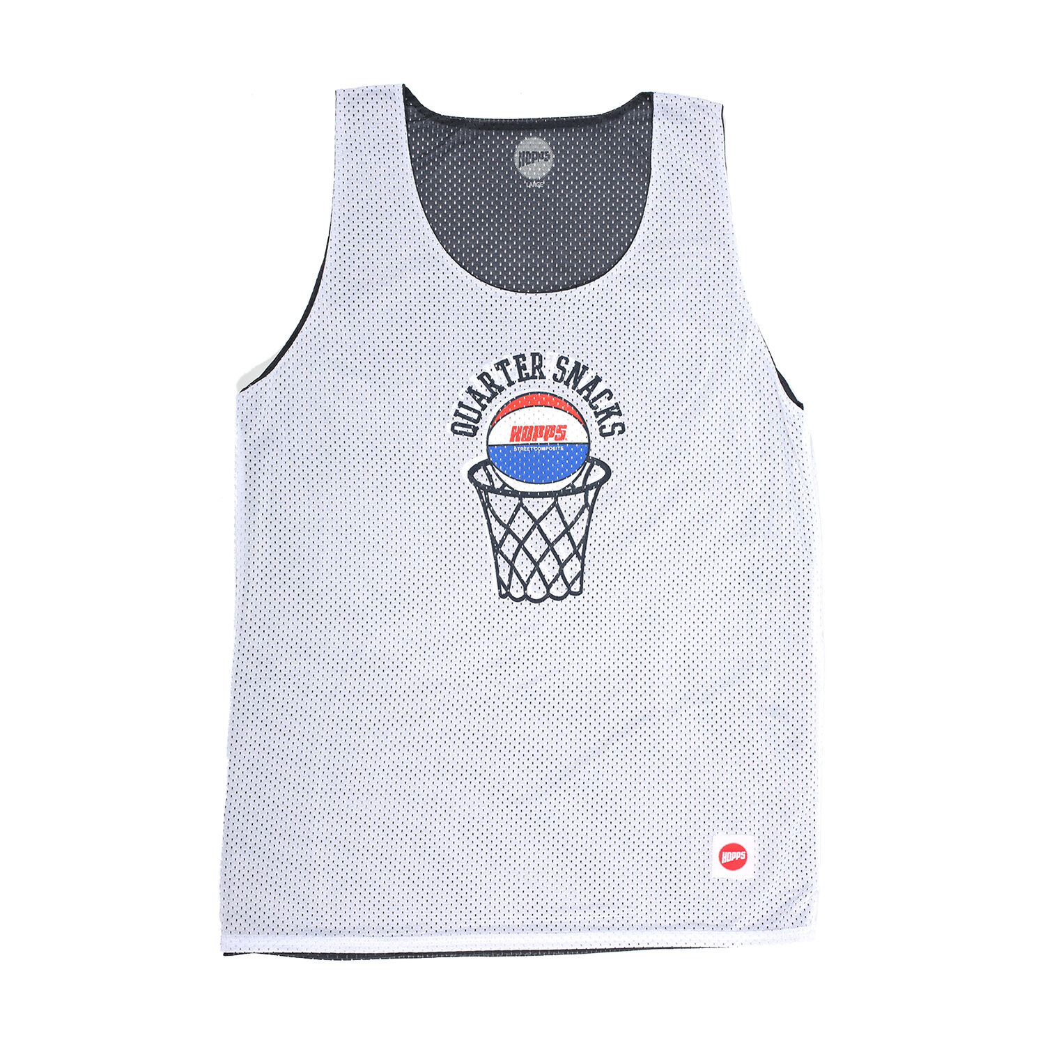 The Street Composite Reversible B-Ball Jersey is a collaboration from Hopps and Quartersnacks that features a front print of art. Hopps label at bottom of the jersey.