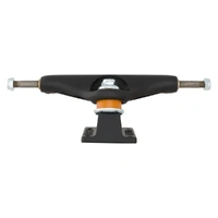 Independent Stage 11 Blackout trucks feature flat black powder coated hanger and baseplate with orange cushions and silver hardware.
