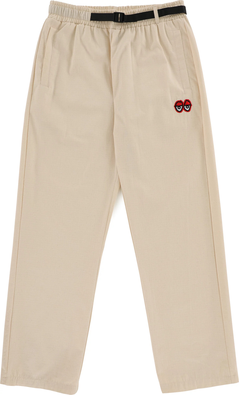Get it straight and ride Krooked with the Eyes Ripstop Pants. Featuring a relaxed fit, elastic waistband with webbing belt, front hand pockets with a rear right pocket and Krooked Eyes embroidery on left leg.