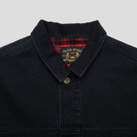Pass~Port Workers Club lined denim jacket in black from range #39. Made from 100% Cotton 16oz Rigid Denim and fine yarn for extra strength. The jacket features flannel lining on the inside and under the collar.