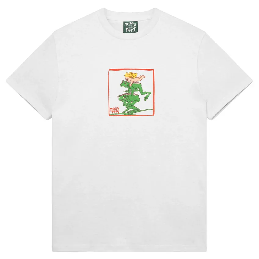 The Leap Frog tee in White is made from 100% cotton and features a screen printed graphic on the front, finishing in the signature Pass-Port fit.