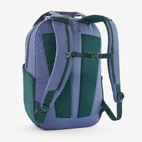 All fabrics, spacer mesh and static mesh are 100% recycled (stretch mesh is 72% recycled), and the body fabric has a durable water repellent (DWR) finish made without intentionally added PFAS; pack volume is 20 litres