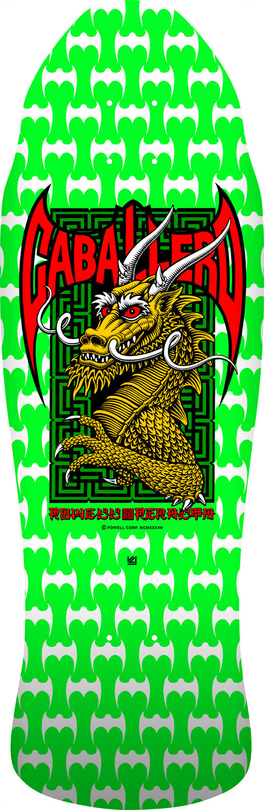 In 1987 street skating was rapidly gaining popularity. Steve Caballero not only excelled at vert skating but was a top contender on the "Street-Style" circuit. Powell-Peralta decided to introduce an additional Cab deck model specifically designed for street. Artist V.C. Johnson created a new dragon graphic with a bats & bones background. Cab's name was also created in the bat shape since Cab was into Batman at the time. The Powell-Peralta logo was made using the Animal Chin font, also a sign of the times.