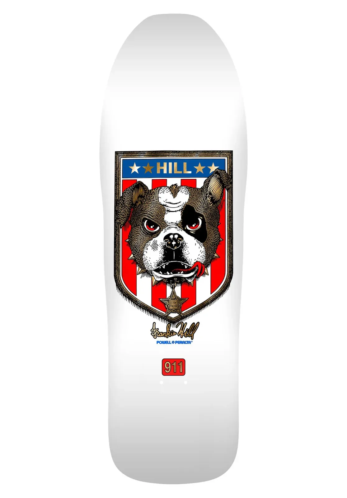 Santa Barbara local Frankie Hill was known for his "go for it" attitude, especially when filming videos. He was featured in Public Domain but Ban This features his breakout part, one minute and 38 seconds of what many today consider proof of Hill’s pioneering stunt work at big rails and huge gaps. After Ban This, Hill received bags of fan mail asking when he’s going to turn pro. The timing was good, too, as a spot opened up with Mike Vallely’s departure. Hill started riding Vallely’s shape, modified with a bigger nose, and on a vacation with Hastings, he poached a bulldog logo from an Amsterdam “coffee shop” and made it his first pro graphic. It was illustrated by Sean Cliver in 1990.