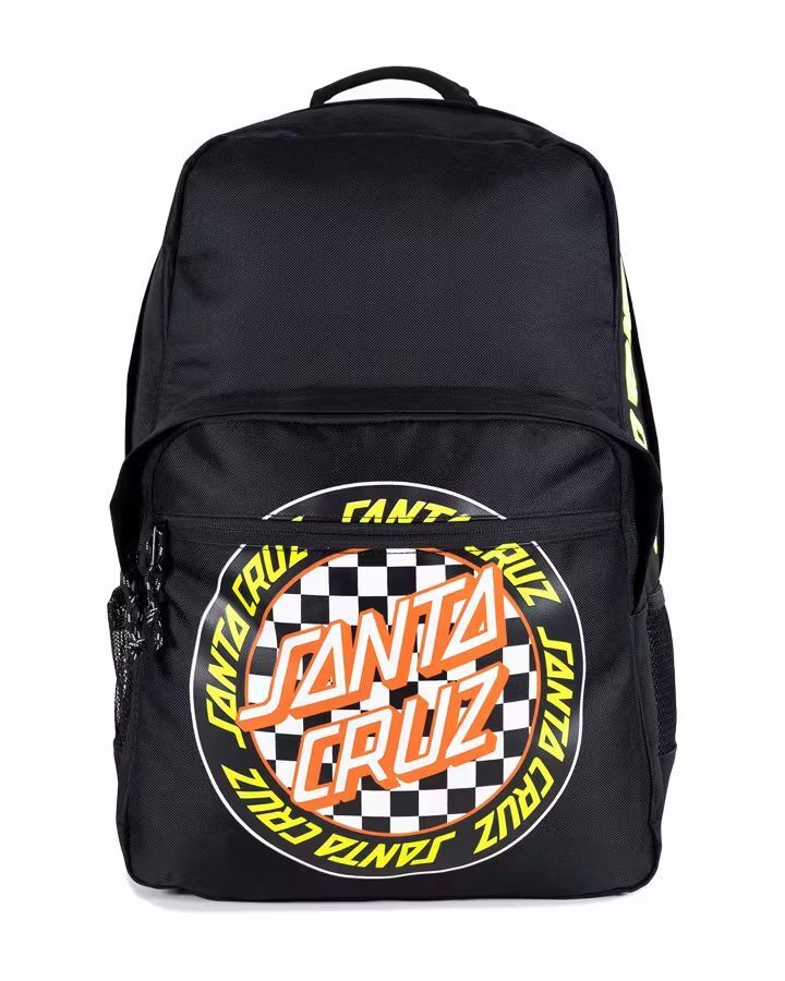 Boys Santa Cruz backpack featuring a screen print of the Outer Ringed Check Dot artwork.
