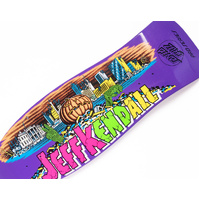 The Santa Cruz Skateboards Kendall Pumpkin Reissue deck features iconic Jeff Kendall Pumpkin artwork by Jim Phillips on a fully dipped matte purple deck, Jeff Kendall's classic Pumpkin reissue shape with a 15.125" wheelbase and Cruz Missile II Concave.