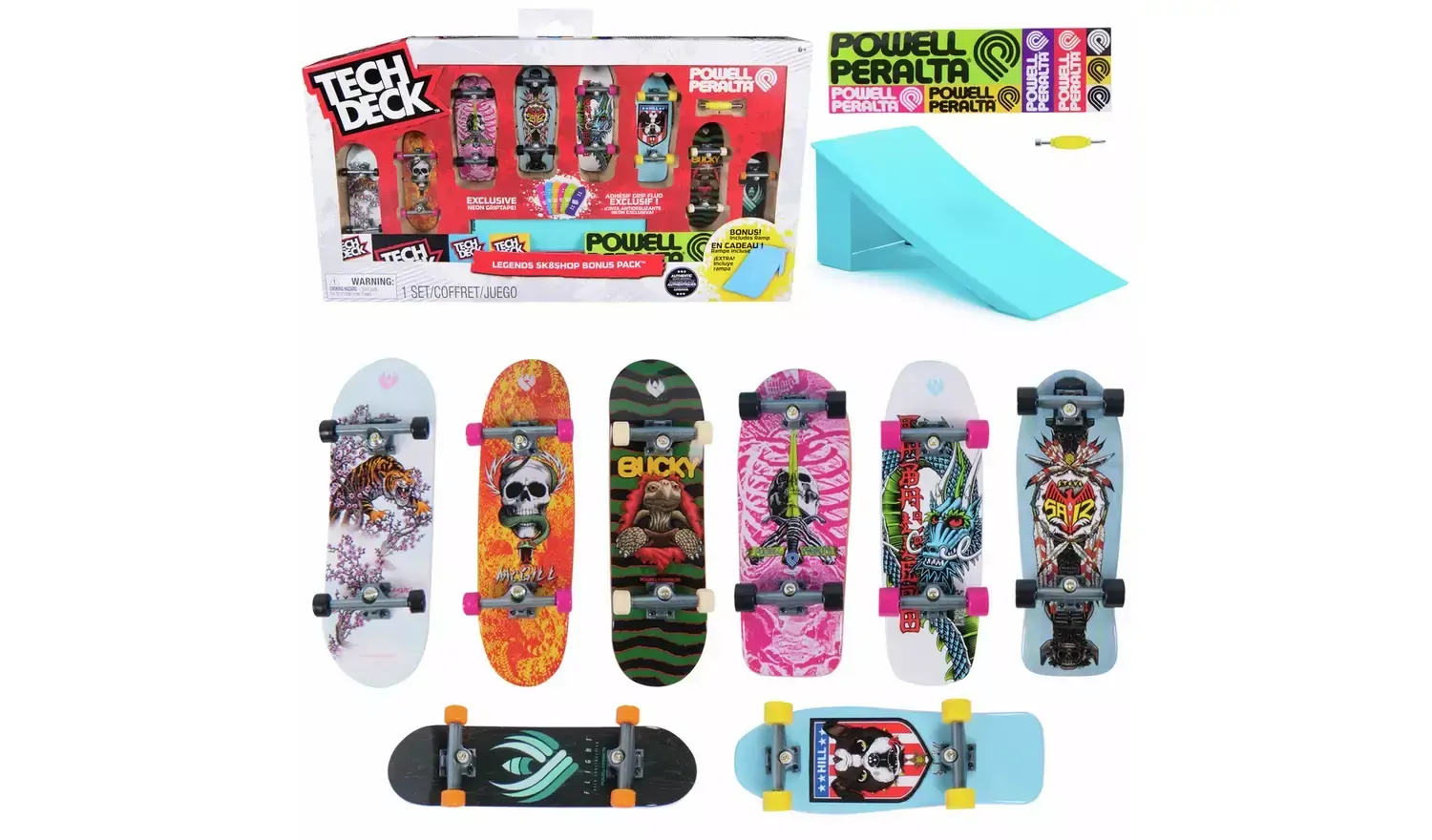 Powell Peralta Skateboard Graphics: The Tech Deck shop Bonus Pack includes 8 finger board decks with authentic graphics from the biggest brands in skateboarding.