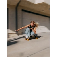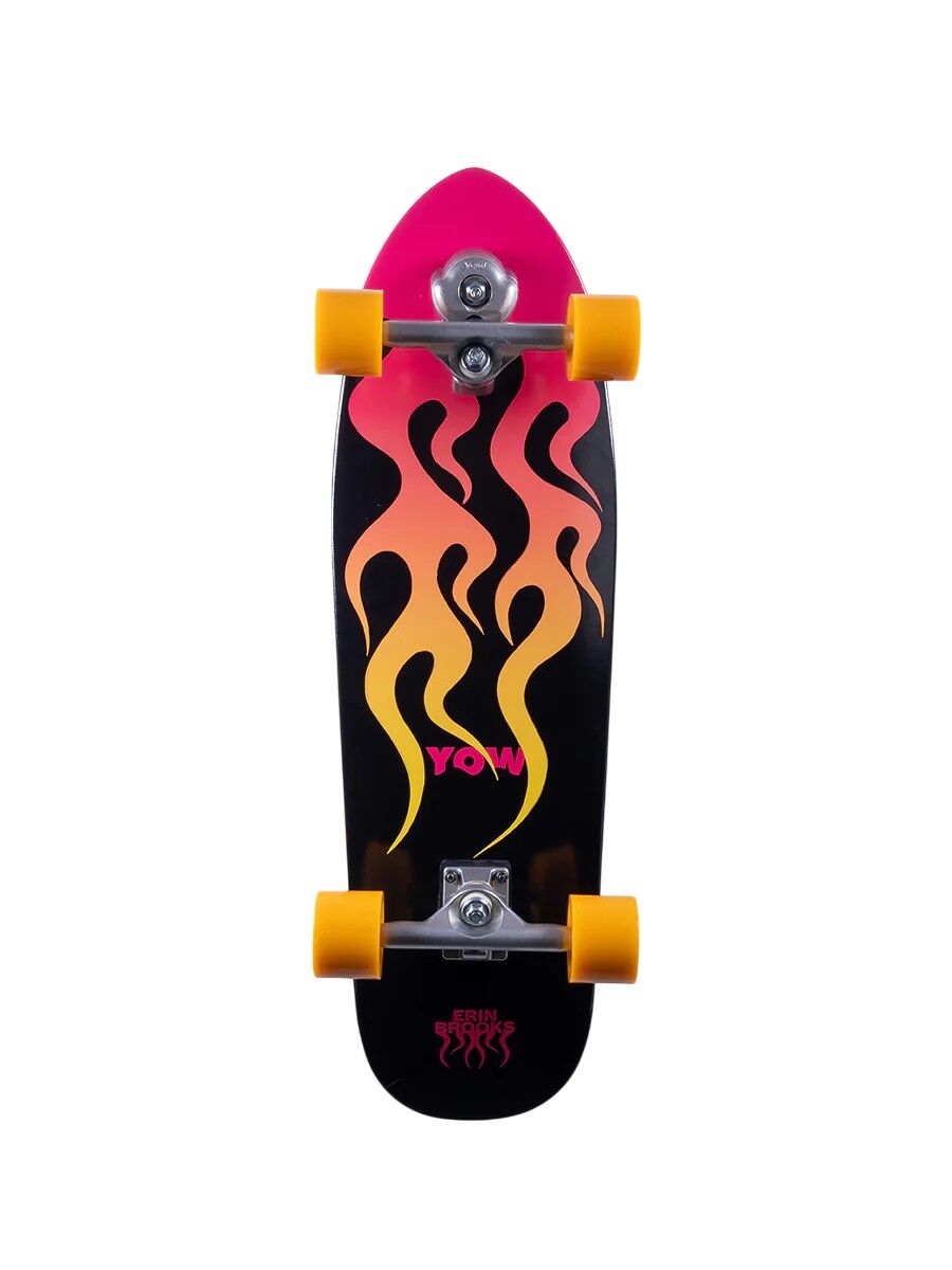 Power Blaze 31.5” x 9.5” x 17”. A surf-board-inspired shape designed to reproduce Erin’s surfing style on land. Featuring a kick-tail and medium concave to keep your feet glued to the board without loosing the surfboard feeling. Mounted on the YOW Meraki S5 surfskate system and 80A Ura wheels for a true surf experience.